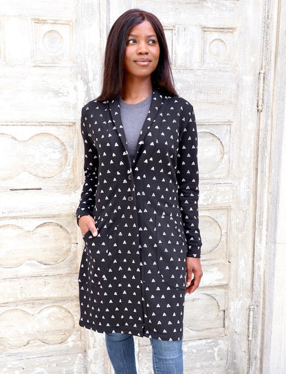 Stay warm and chic with the Hudson black fleece coat. Made with organic cotton fleece and features a front button closure, soft color, and deep pockets. The pattern is playful, and the neutral colors make this coat the perfect outer layer for fall. Cotton fleece is similar to a sweatshirt material- cozy on the inside with no nap on the outside.