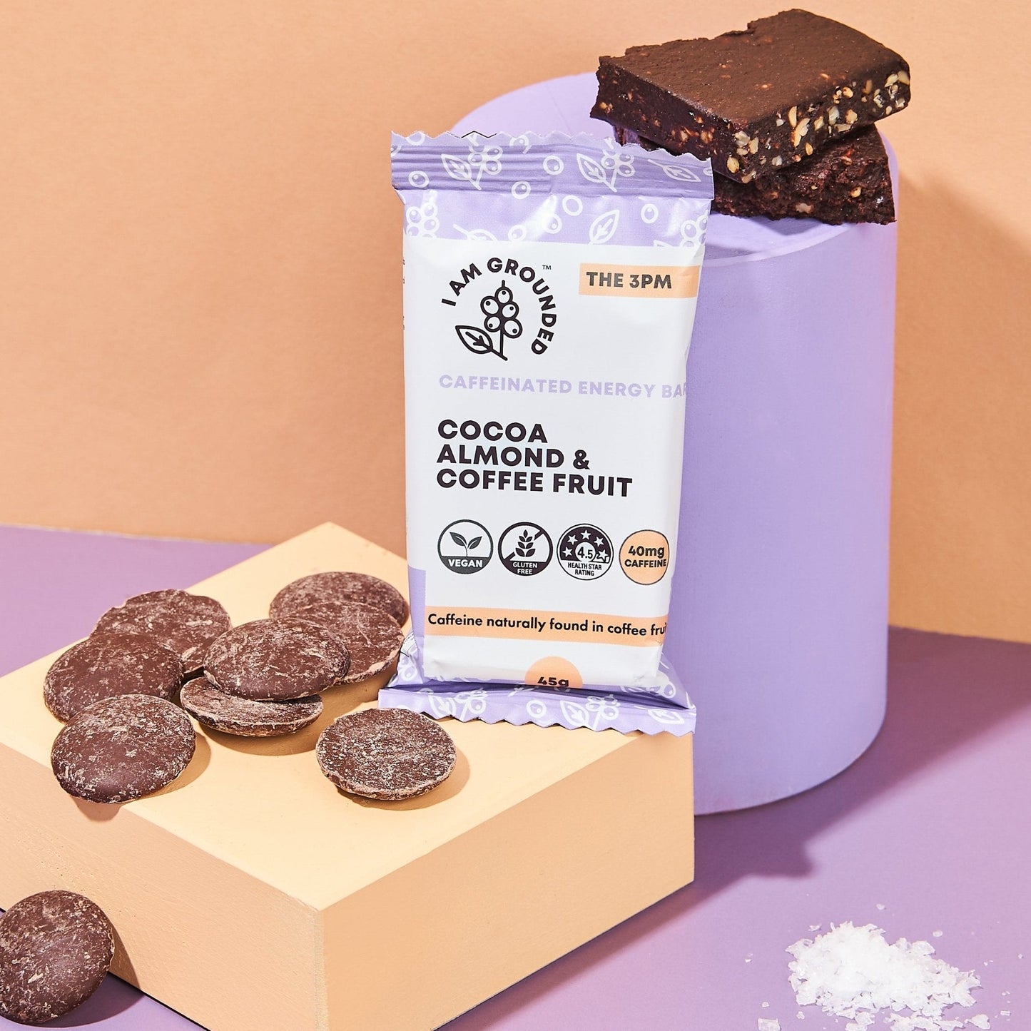 I Am Grounded THE 3PM - Cocoa, Almond & Coffee Fruit bar is perfect for those chocolate lovers looking for a 3PM fix! I Am Grounded THE 3PM is flavanoid rich cocoa, combined with vitamin-E-packed almonds make this a perfect afternoon brain boost. Tastes like a brownie, with the natural sweetness of coffee fruit.
