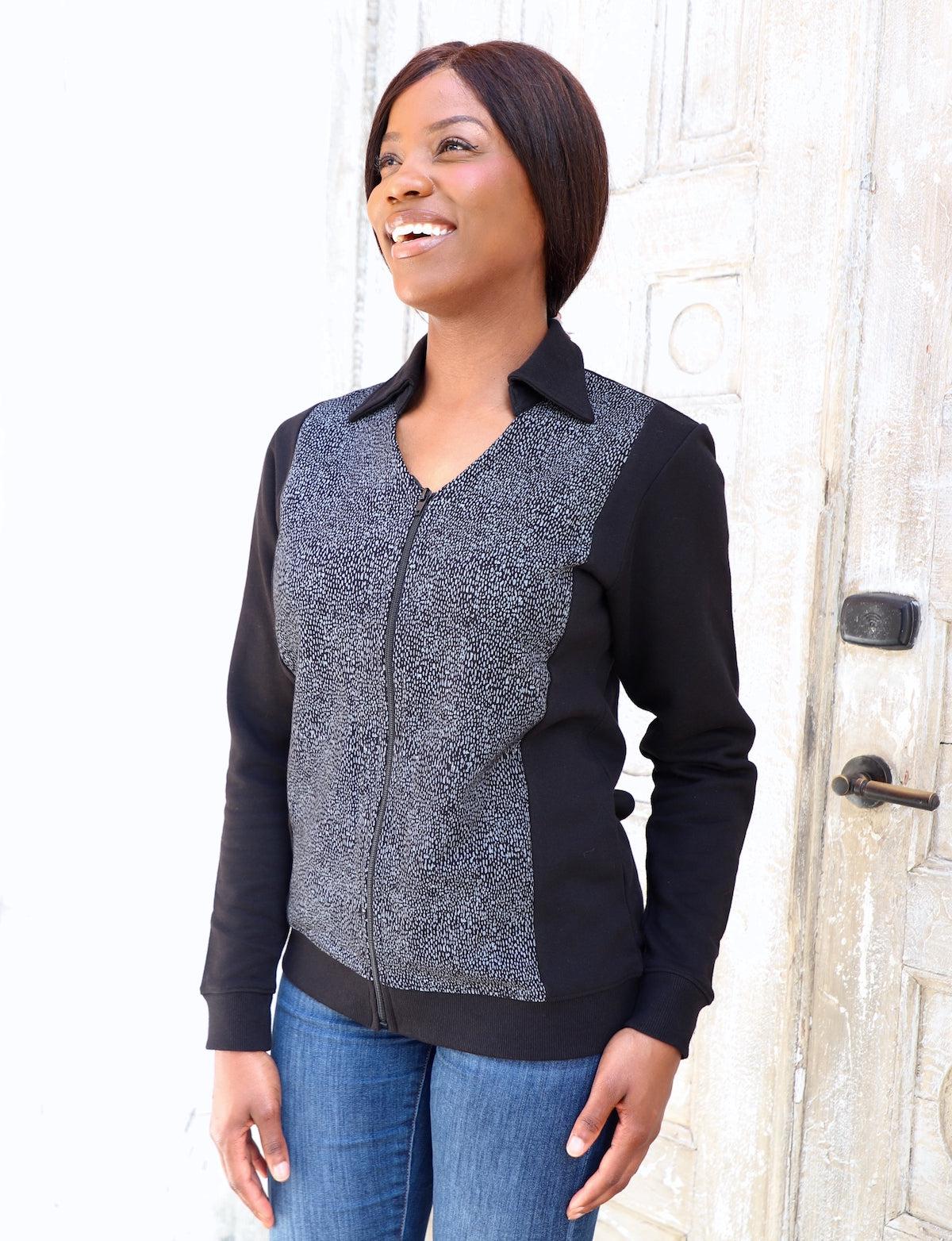 Everybody needs a good fall jacket. Luckily, our Kalani black fleece jacket is here to save the day! Made with soft warm cotton fleece in black with a zipper front and collar, you will look great and stay warm all season long. Cotton fleece is similar to a sweatshirt material- cozy on the inside with no nap on the outside.