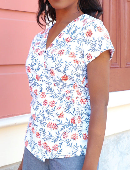 This short sleeve floral wrap top is made from our softest modal fabric. It feels like wearing a hug – stretching and curving in all the right places. The Lata Organic Wrap Top has a navy and coral floral print with a tie closure. It’s great for nursing or pumping mothers.