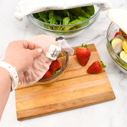 Our washable and reusable linen Bowl Covers are the perfect replacement for disposable plastic wrap and foil. Our Bowl Cover design utilizes a cord stop and drawstring which provides ultra flexible sizing and a customizable, snug fit for each container size. We like to use them to cover foods that need to retain moisture like salads, fruit, and pastas. Once soiled, simply throw them in with the laundry, wash, and reuse!