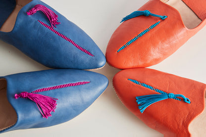 The tanneries in Fez and Marrakech are famous for the brilliant colors and assortment of hides. Vegetable dyes such as saffron (yellow), mint (green), poppy flower (red), indigo (blue), henna (orange), and cedar wood (brown) are used to create these gorgeous hues. The slippers in the Verve Culture Collection are elevated with embroidery and tassels. They are available in two iconic color combinations orange with blue embellishment and blue with fuchsia.