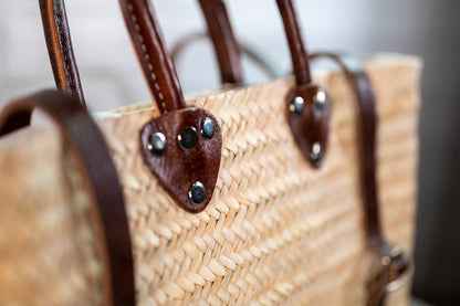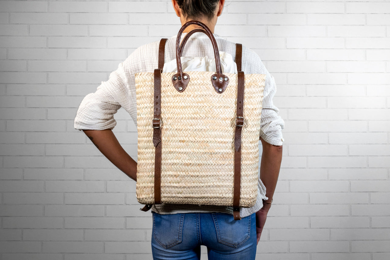 Moroccan basket-making regions are identifiable by the material used to form the body of the bag. These backpacks are made with Dwarf Palm from an area north of Fez that gives a special balance between great strength and softness. Artisans near the Atlas Mountains (where the Dwarf Palm is indigenous) weave the fine palm, and leather workers in Marrakesh finish the straps and handle.