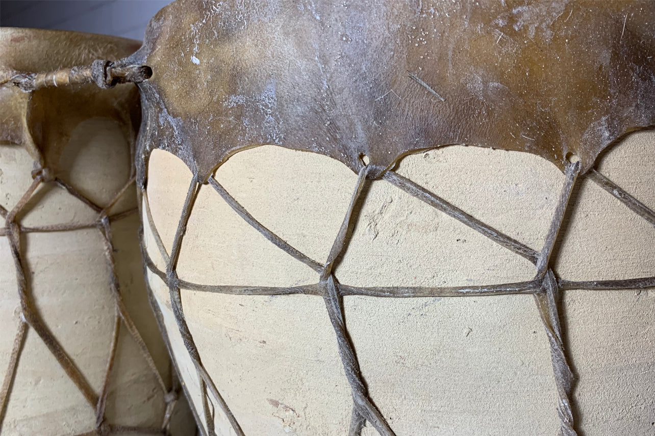 A double drum made from ceramic bowls covered with goatskin. One side is larger than the other, resulting in two different pitches. These bongos have been made for centuries by Moroccan artisans, gazing at these drums alone can send you back to exotic bazaars and music filled nights under starry deserts. This is a professional quality, ceramic bongos. Because there is a lot of lacing, the drum will always stay tight and tuned.