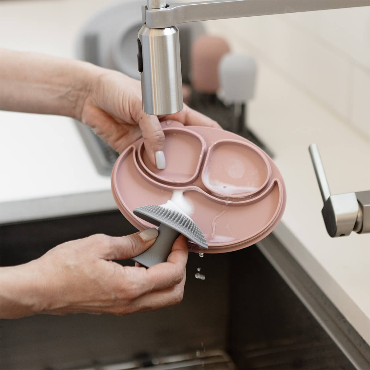 ezpz’s Mushroom Sponge is perfect for washing ezpz products, dishes, cookware and feeding gear. Due to the silicone material, the Mushroom Sponge is hypo-allergenic, odor-resistant and long-lasting. -