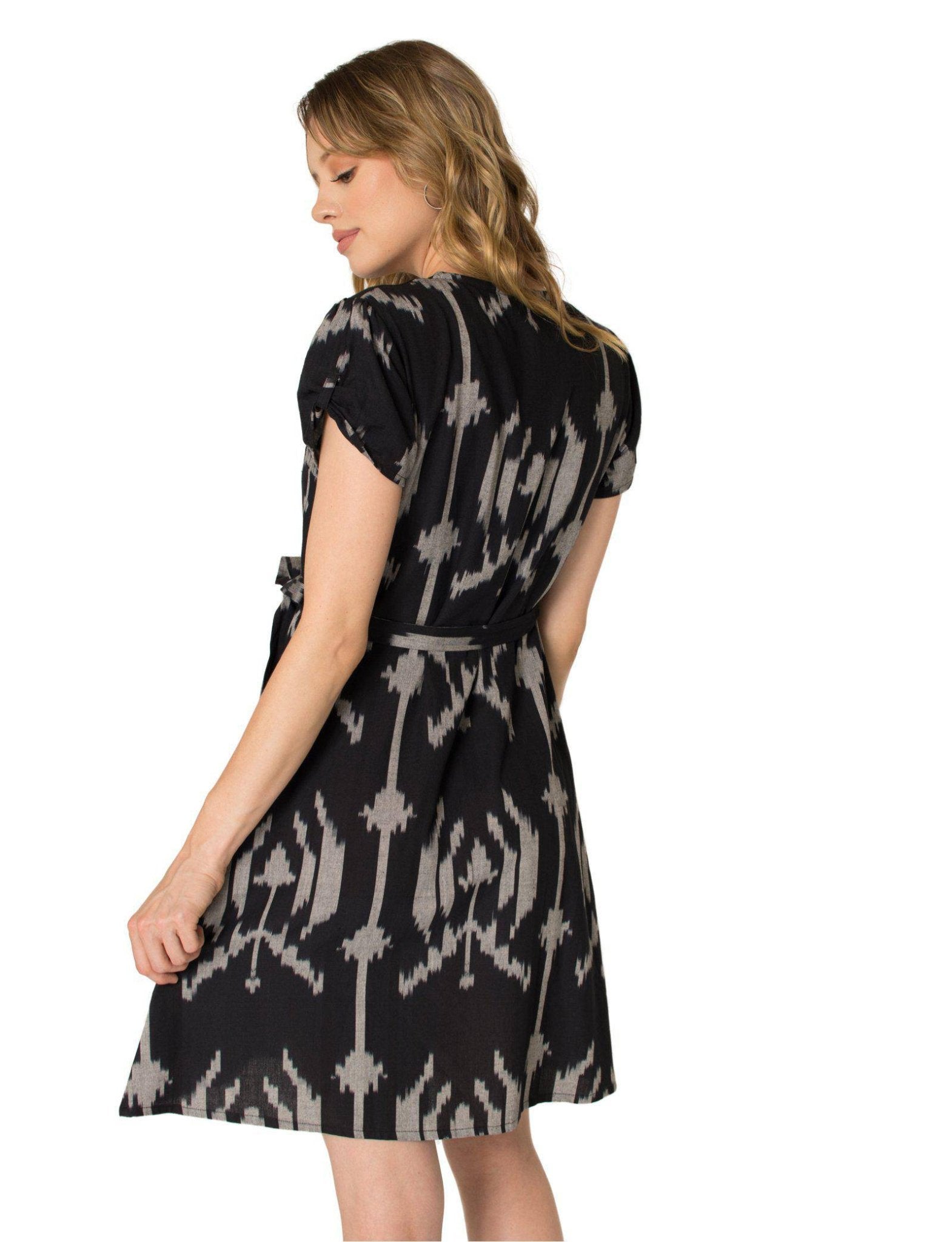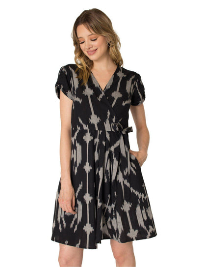 Who doesn’t love a wrap dress? This ikat wrap dress is stunning on a number of different body types including those who are a little more busty on top. This wrap dress features a large geometric black and white handwoven ikat design that is as unique as you are. Pleats in the front of this dress give it a feminine, flirty feel. Plus the dress has pockets and a hook n’ eye closure at the bust for added comfort.