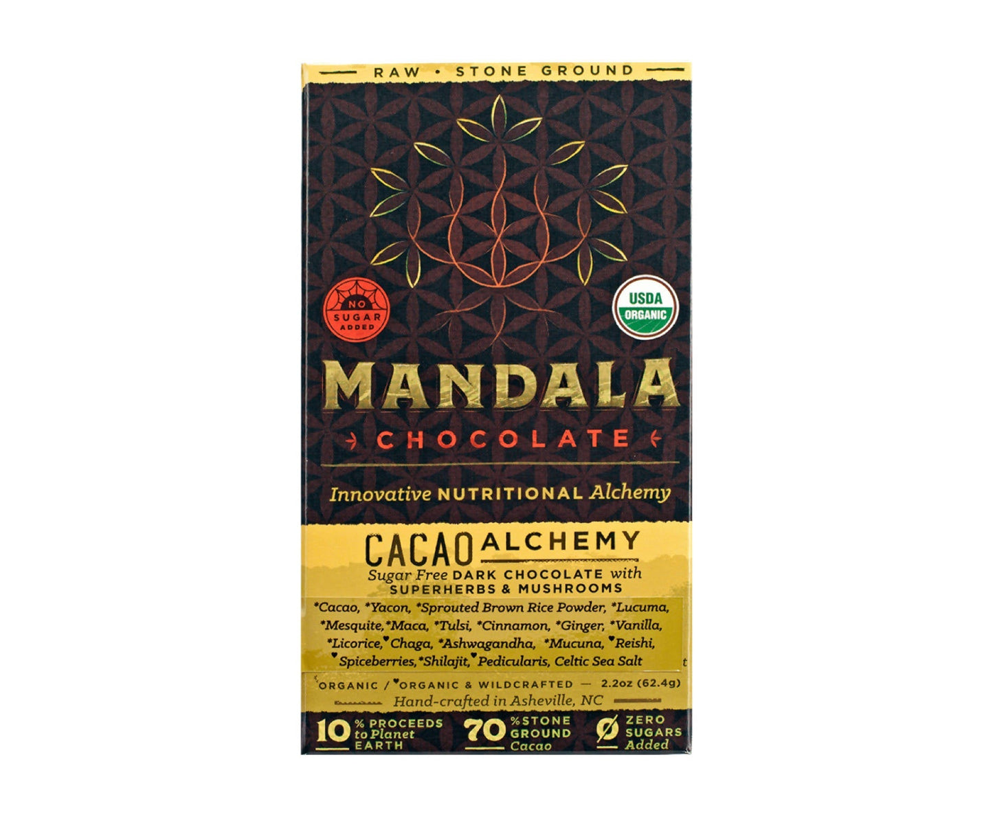 Mandala Chocolate's Organic Raw 70% Cacao Alchemy Dark Chocolate offers inspiration through the healing power of cacao and the most powerful and best-sourced herbs in the world. The result is sugar-free chocolate, unlike anything you have ever experienced before. Every batch is intuitively handcrafted, stoneground and marble tempered..