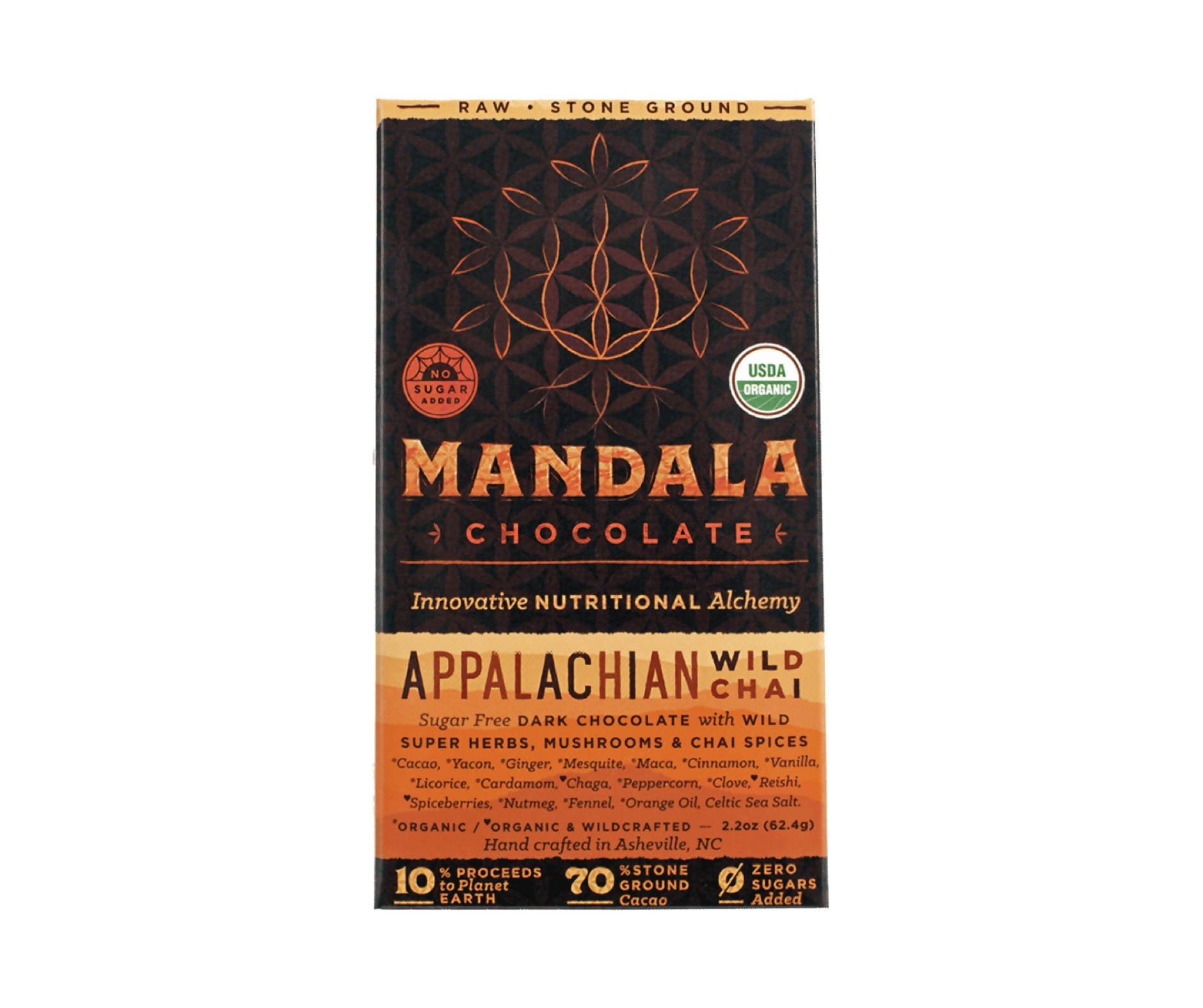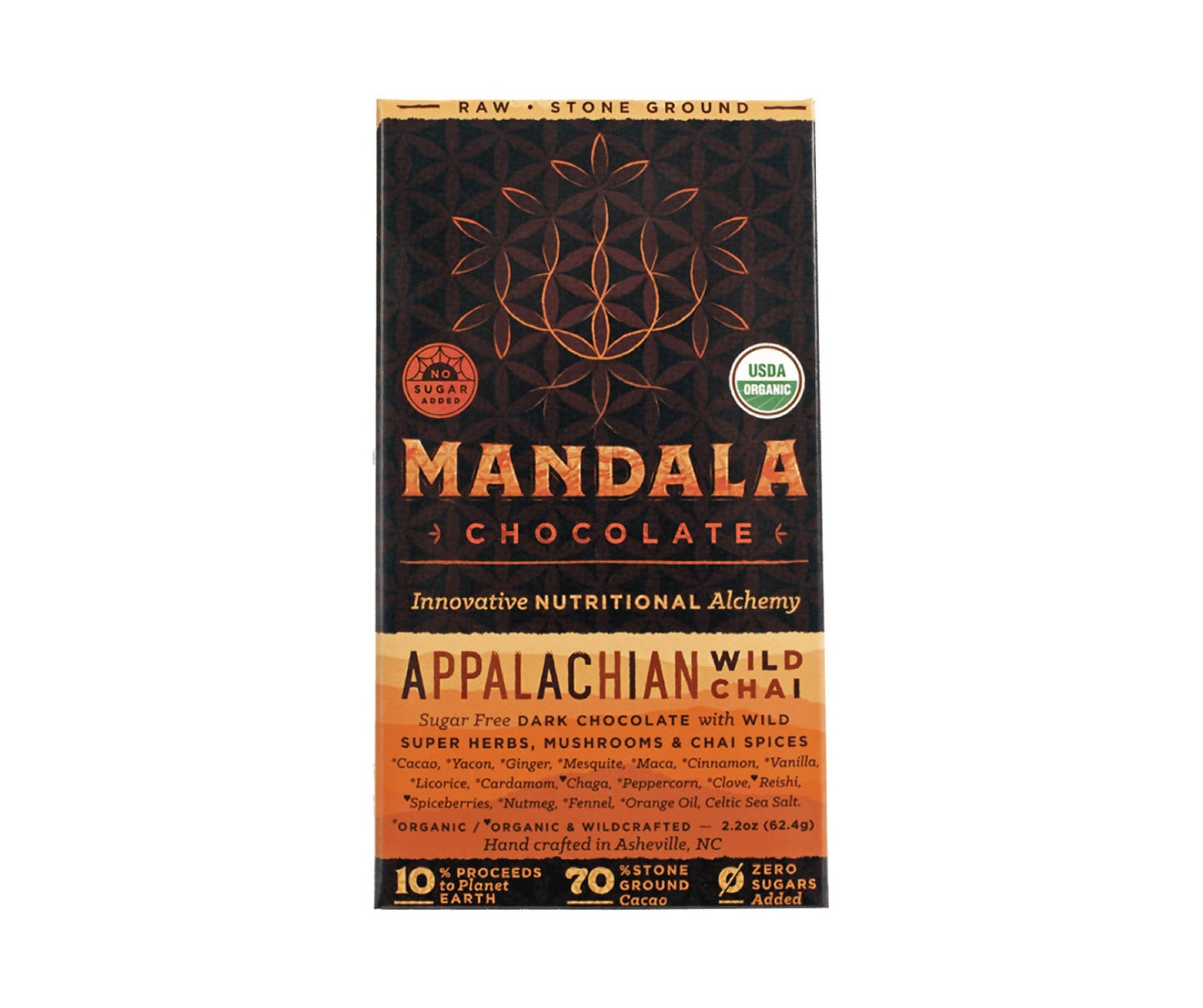 Mandala Chocolate's Organic Raw 70% Cacao Appalachian Wild Chai Dark Chocolate features ingredients wild-crafted from the pristine Blue Ridge Mountains and a blend of traditional chai spices. With no added sugar this chocolate is a tasty salutation to your Health!