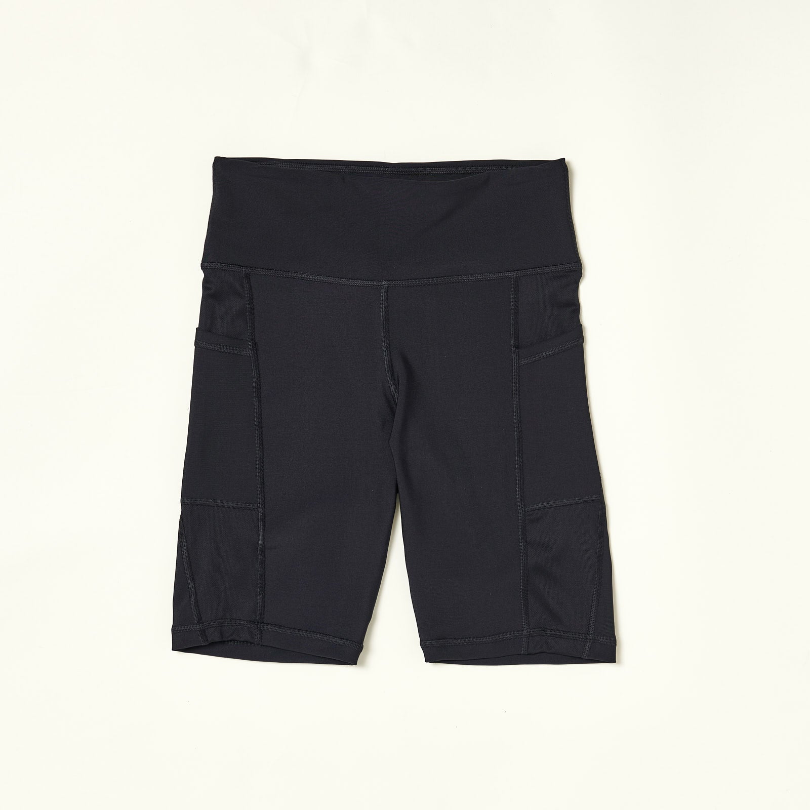 High-waisted biker short with flatlock stitching. Side pocket for valuables. Mesh detailing on the bottom. Look good, play good and most importantly feel good.