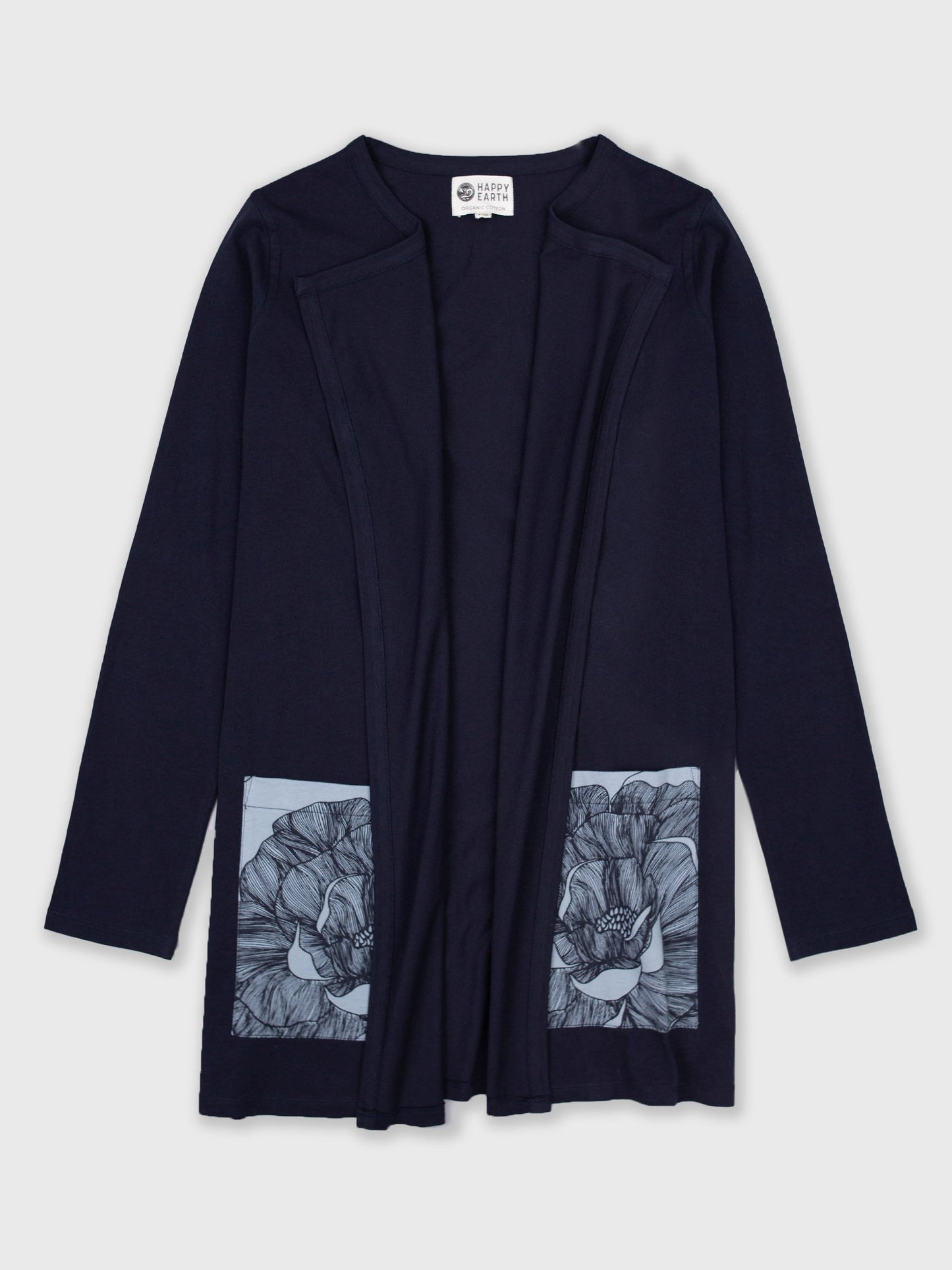 Your coastal grandma style, upgraded. Navy-colored open-front cardigan with pockets featuring large blooming florals. The perfect light-layer that adds a touch of personal flare.