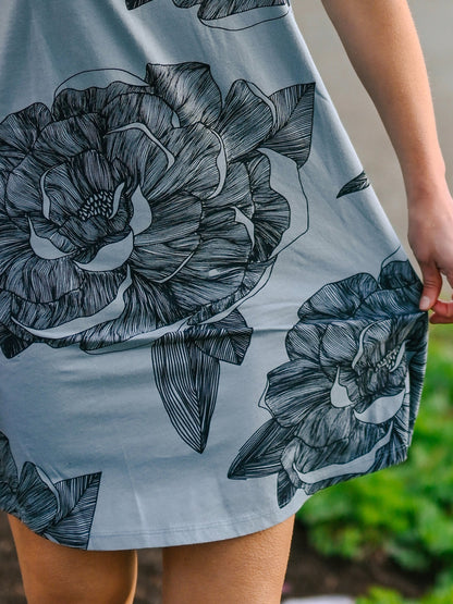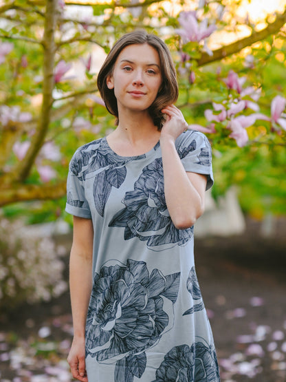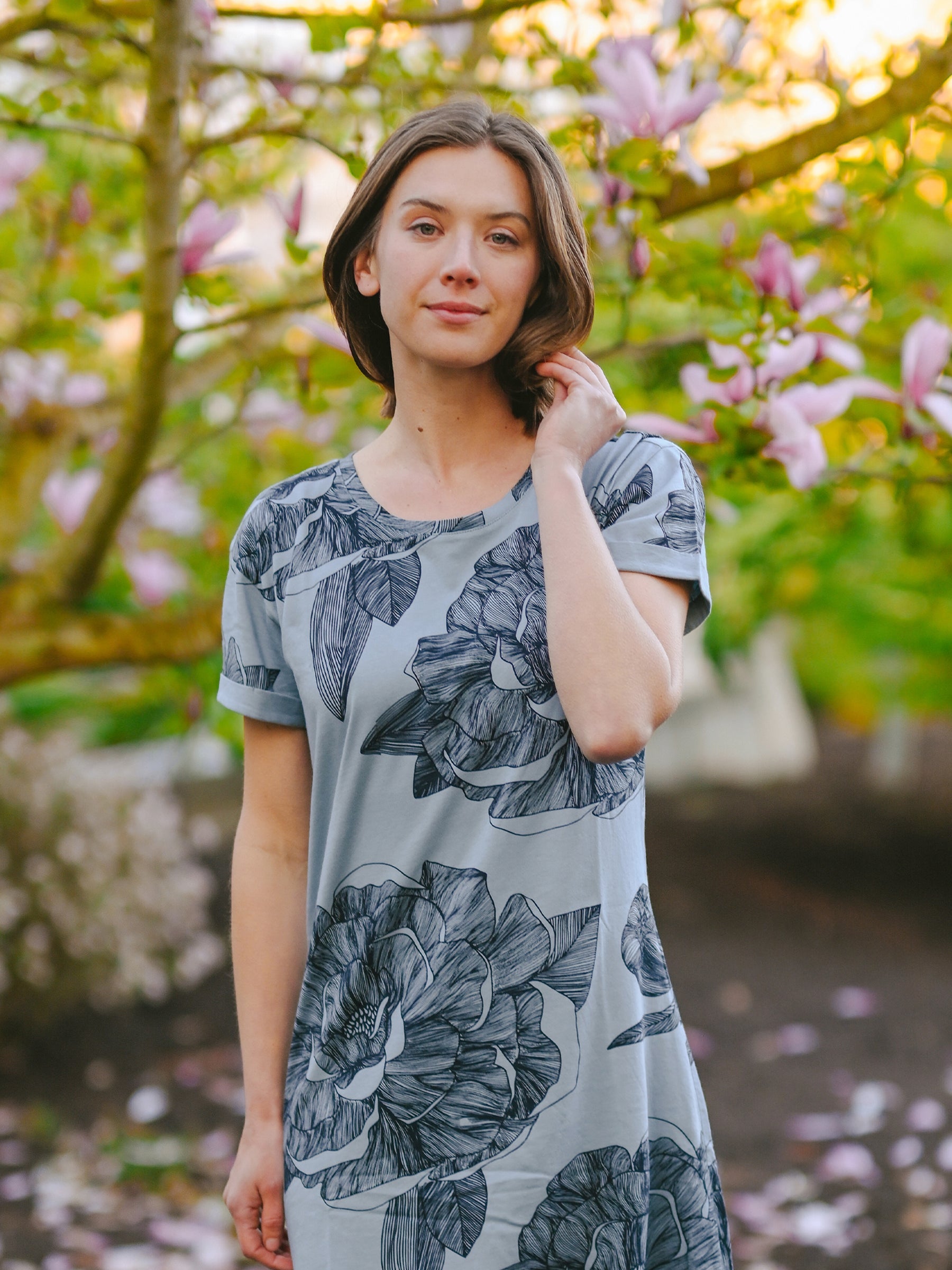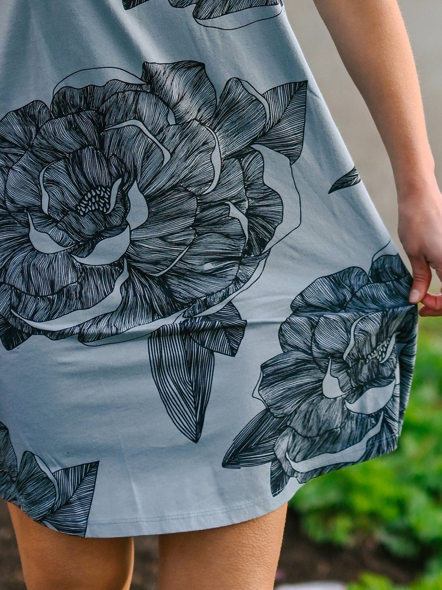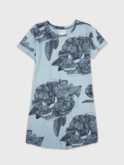 A coastal cottage twist on a tropical pattern. Large peony blooms cover this sky blue tee. The peony is a favorite floral in cooler climates and a signature of spring + summer.
