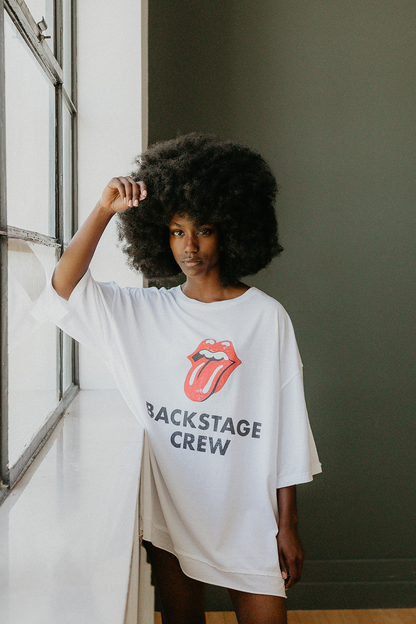 A must have for all rock 'n' roll fans, our Rolling Stones Backstage Crew Oversized Tee showcases the band's iconic logo and a handwritten set list on the back. Crafted with a premium blend of Modal and Organic Cotton and cut oversized, it is flattering on all body types. Rock it as a dress or over your favorite pair of jeans for a more relaxed look.