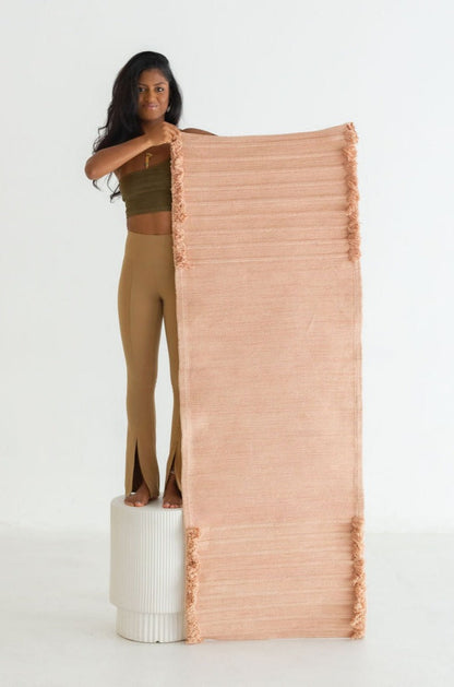 Unleash your potential with our herbal dyed yoga rug! Rejuvenate on the world's most natural yoga mat. Each mat is handloomed with GOTS certified cotton and plant dyed using an ancient process that preserves the bioactive medicinal qualities of the plants. Feel the difference and experience your strength, balance and wellness soar on the beautiful and ethically made mat.