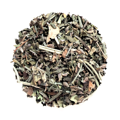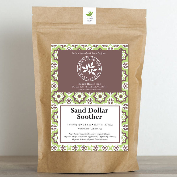 Tame your tummy's troubles with Sand Dollar Soother, a 100% organic and herbal loose leaf tea expertly crafted to bring you comfort. This harmonious blend features the soothing embrace of rosemary, thyme, mint, lemon verbena, and a touch of aniseed.