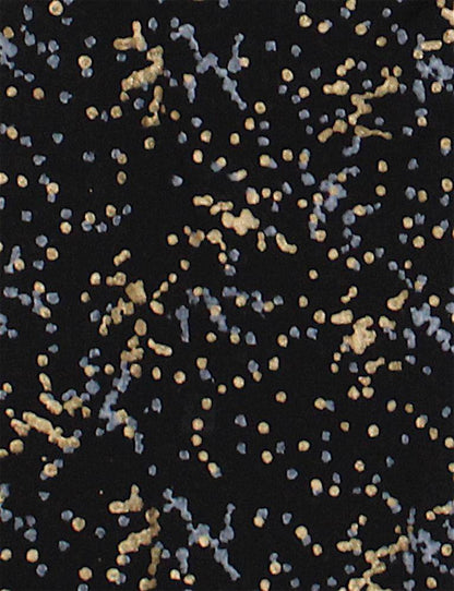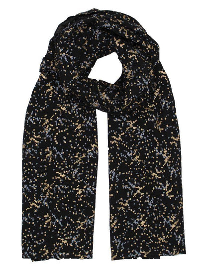 • Dress up that basic black dress with this beautiful black, gold and silver scarf featuring a metallic gold and silver splatter dot block print.