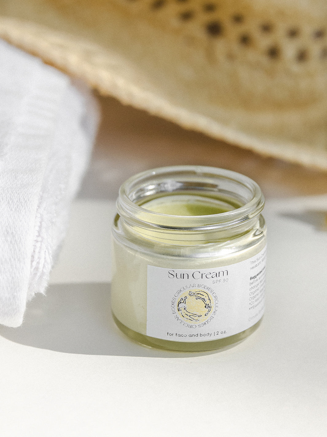 This Sun Cream is a mineral based moisturizing cream that is naturally water resistant. The combination of non nano zinc oxide with other SPF ingredients gives this formula the protection equivalent to a 30 SPF. Apply to face and body to protect our waters while having fun this summer.