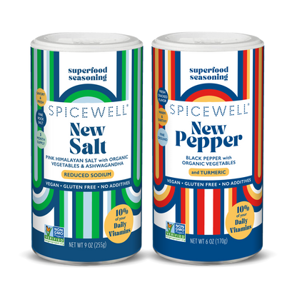 A duo to love - New Salt and New Pepper with 21 vitamins and minerals all sourced from organic vegetables - are now in a convenient shaker format that works on your countertop or your table! -