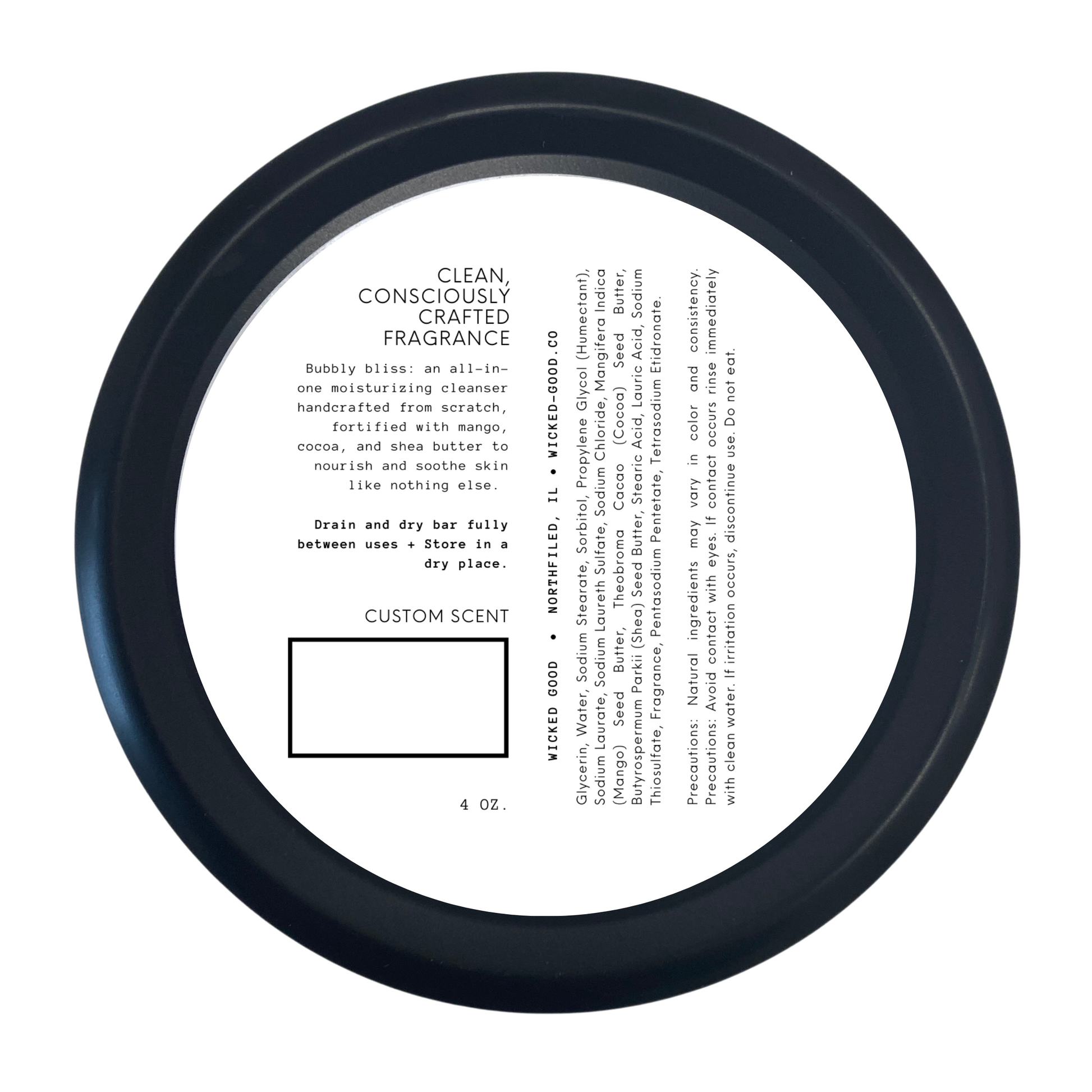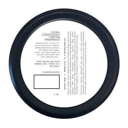 Bubbly bliss: an all-in-one moisturizing cleanser handcrafted from scratch, fortified with mango, cocoa, and shea butters. Our traditional cold process, solid body wash cleanser is enriched with three amazing butters to nourish and soothe skin like nothing else.