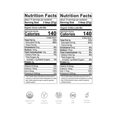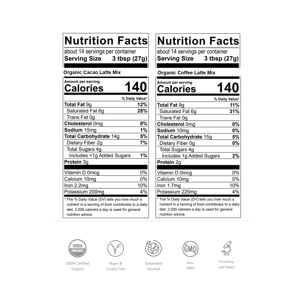 Organic Cacao Lattes are designed with raw cacao, reishi mushroom and ashwagandha – ingredients proven to reduce oxidative stress, boost immunity and improve mood.