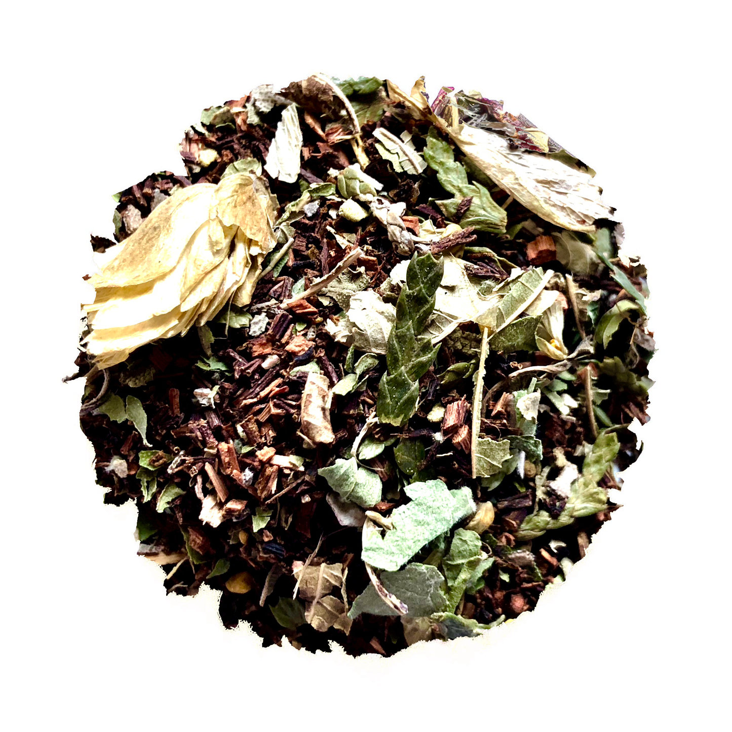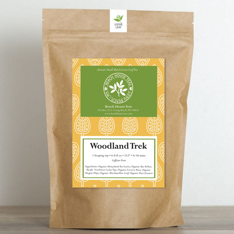 Woodland Trek, a 100% organic loose leaf tea, is a carefully crafted blend that transports your senses to the heart of nature. This unique infusion features honeybush tea as its base, infusing every sip with a natural sweetness that harmonizes perfectly with the robust undertones of licorice and sage. The addition of organic Washington hops imparts a subtle snap, reminiscent of the crisp wilderness air, and a hint of sweetness from bee pollen rounds out the flavor profile, like the gentle kiss of wildflowers in bloom. Infused with organic cedar tips, every sip beckons forth memories of evenings spent camping beneath the starry canopy or hiking the breathtaking cascades, where the scent of the forest and the call of the wild create an ambiance that lingers in your soul long after the journey's end. Woodland Trek is more than a tea; it's an invitation to relive the magic of the great outdoors, where the serenity of the forest and the majesty of the mountains are captured in every aromatic, soothing cup.